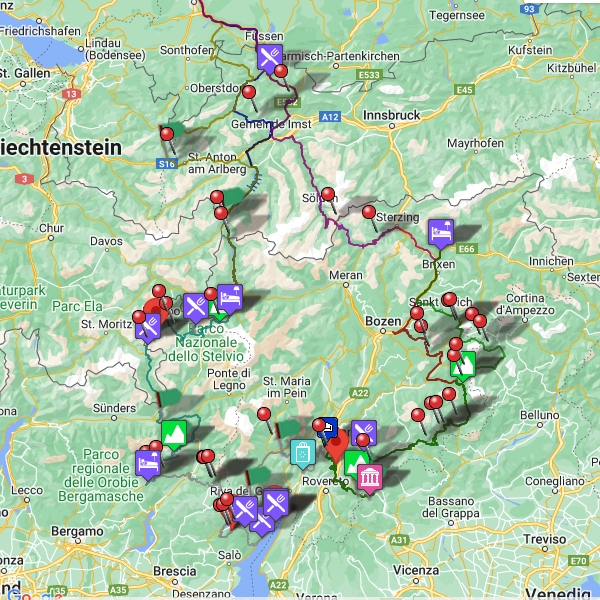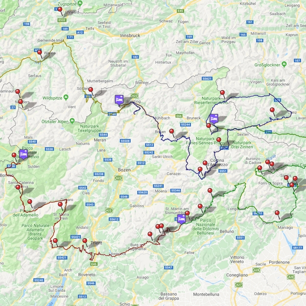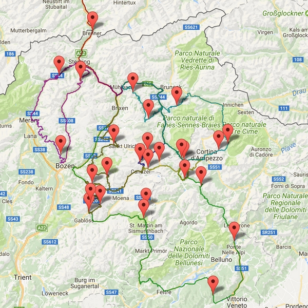 2016 Südtirol & Dolomiten Tour: Die Tour ist ausführlich im Tourbericht beschrieben daher hier nur die Karte. Streckenführung: Gut ausgebaute Straßen Streckenprofil: LandStrße, Passtraße, Bundesstraße Strecken Info: mehr als 1000Km und 24 Pässe |