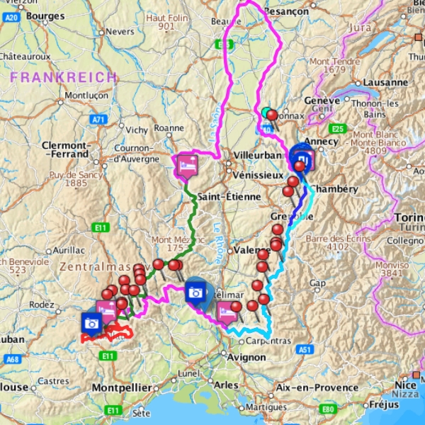 2025 Ardéche Eine 6 Tages Tour: Doch es sind nur 4 Tage Spaß und Vergnügen. Etappe 1 ist die Anfahrt zur Ardéche mit herlichen Pässen. Eine Tour mit mehr als 30 Pässen und Sehenswürdigkeiten. Streckenführung:Anspruchsvoll da sehr kleine Straßen Streckenprofil: Einspurig, Passtraße, Bundesstraße Strecken Info: 2600 km |