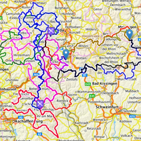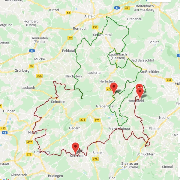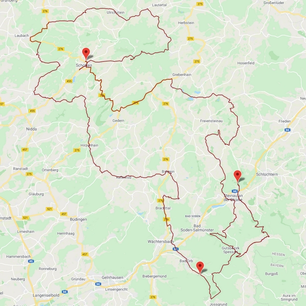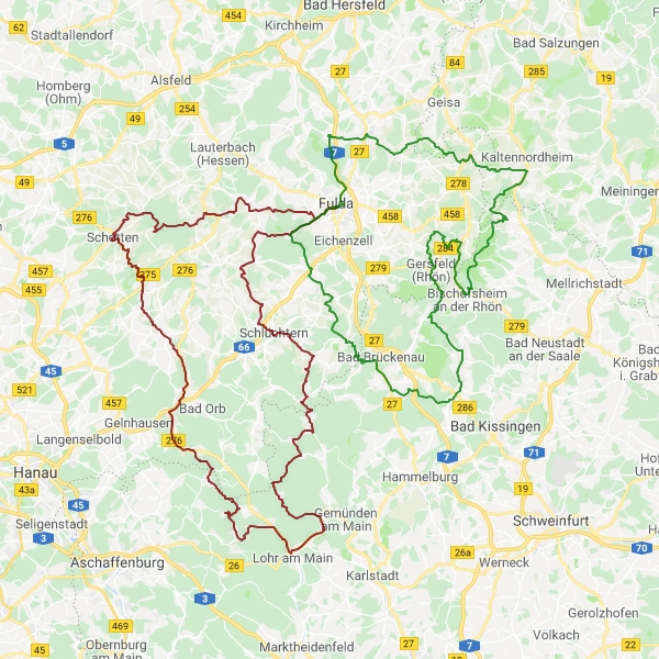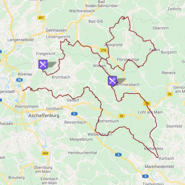 Straßen Streckenführung:Karlstein, Sailauf, Heigenbrück, Hafenlehr, Partenstein, Habichsthal, Wiesen, Flörstbachtal, Fellen, Geisenbach, Niedersteinbach Streckenprofil: Sehr gute straßen Strecken Info: 230Km / 4:10h + 290/ 5:15h |
