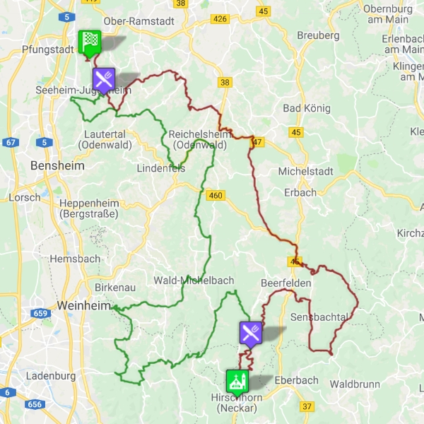 Auf kleinen und kuvigen Straßen geht es durch den Odenwald Streckenführung:Mühlthal, Wurzelbach, Ernsthofen, Fischbachtal, Fränkisch-Crumbach, Hesseneck, Beerfelden, Hirschhorn, Rothenberg, Raubach, Heiligkreuzsteinbach, (Wendenkopf) Ursenbach, Gorxheim, Wad-Michelbach, Reichelsheim, Balkhausen, Steigerts Streckenprofil: Sehr gute straßen Strecken Info: 239Km / 4:45h |